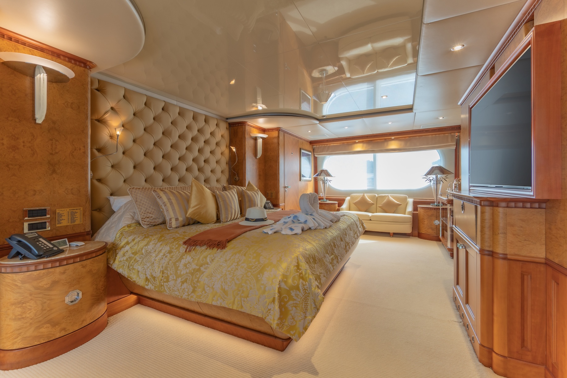 The suite also includes a private study, lounge area, and a marble-finished bathroom with a deep tub. It’s a true owner’s space – private, spacious, and properly integrated into the yacht’s layout.