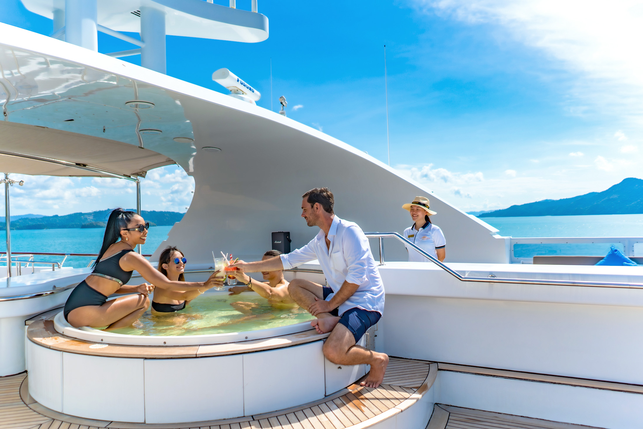 The sundeck is one of AZUL V’s strongest features. A large Jacuzzi sits centrally, flanked by oversized sunpads and a wet bar.